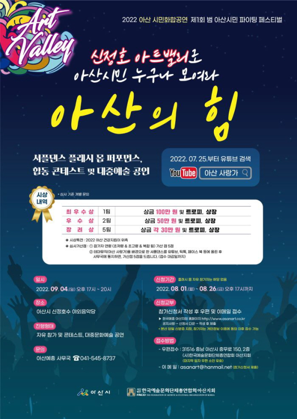 플래시 몹 콘테스트 참가신청은 오는 26일 오후 5시까지 한국예총 아산지회 홈페이지에서 참가신청서를 내려받아 작성 후 우편 및 이메일로 접수하면 된다.