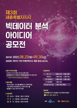 [충청뉴스 최형순 기자] 세종시는 22일부터 오는 9월 30일까지 ‘데이터기반의 미래전략수도 세종 완성’이라는 주제로 전 국민 대상 ‘제3회 빅데이터 분석 아이디어 공모전’을 개최한다.