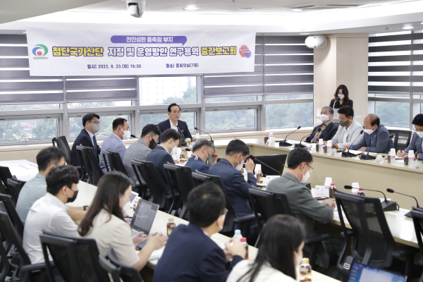 시는 지난 23일 시청 중회의실에서 박상돈 천안시장을 비롯해 육종영·김철환 시의원, 종축장이전개발 범천안시민추진위원회 위원장, 천안과학산업진흥원장, 관계공무원 등 20여 명이 참석한 가운데 ‘천안성환 종축장부지 첨단국가산업단지 지정 및 운영방안 연구용역 중간보고회’를 개최했다.
