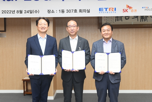 ETRI는 24일 SK증권, 에트리홀딩스㈜와 500억원 규모의 디지털 ESG 기술사업화 투자조합에 대한 내용을 담은 협력양해각서를 체결했다고 밝혔다.