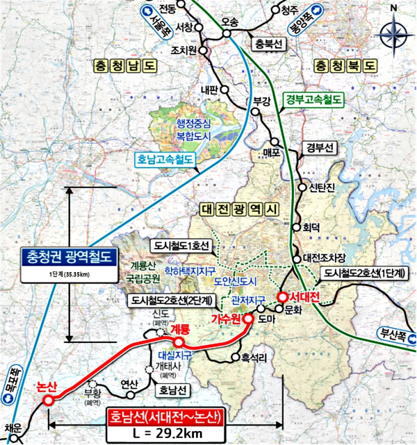 호남선 고속화 사업의 예타가 통과됨에 따라 국토부(국가철도공단)는 내년부터 총사업비 7192억(국비 100%)을 투입해 2027년 준공을 목표로 대전시 가수원~충남 논산시 29.2㎞ 구간의 굴곡 노선 직선화 및 선로 개량 공사를 본격 추진한다.