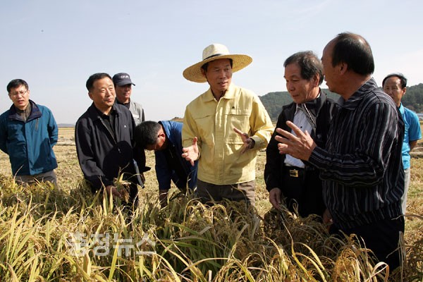 나소열 서천군수가 13일 오후 마서면 산내리 서래야 쌀 재배단지에서 농민 30여명과 함께 영농 현안에 대한 대화를 갖고, 풀을 먹고 자란 서래야 쌀 수확체험에 참여했다.
