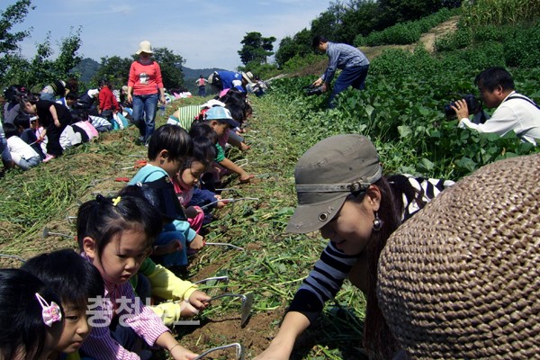 ▲ 오박사마을에서 고구마 캐기 체험을 하고 있는 어린이들의 모습.