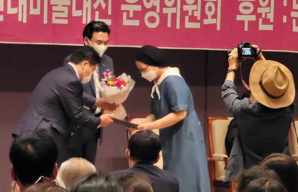 서울 프레스 센타에서 25일 초대작가상을 받고 있는 전)최종환 마리엘리사벳수녀(우)