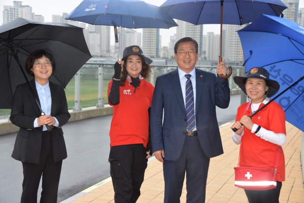 한편, 이날 2명 1개 조로 편성불시 발생할 우려가 있는 금강보행교를 순찰하는 119 봉사단에게 시민들의 감사한 마음을 전했다.