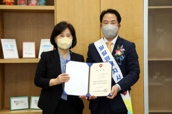 송미정 지사장으로부터 명예지사장 위촉장을 받은 상병헌 세종시의회 의장