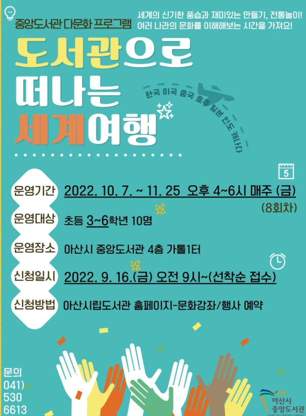 모집은 다문화에 관심 있는 초등학생 3~6학년을 대상으로 선착순 10명을 모집한다. 신청은 아산시립도서관 홈페이지 문화강좌·행사 예약 페이지에서 할 수 있다.