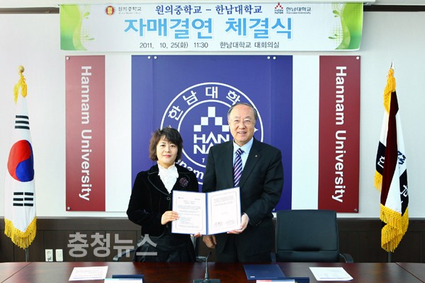 한남대는 25일 교내 대회의실에서 원의중학교 교장과 행정실장이 참석한 가운데 이러한 내용의 양해각서를 체결했다.