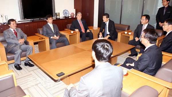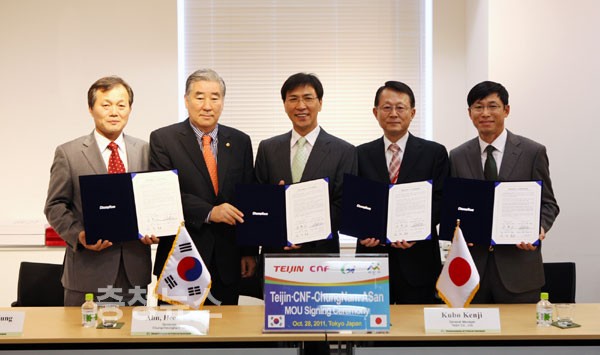 아시아 3개국을 순방 중인 안희정 충남도지사는 28일 일본 도쿄에서 구보겐지 테이진사장, 노승익 CNF 사장, 김석중 아산시 부시장과 투자협약(MOU)을 체결했다.