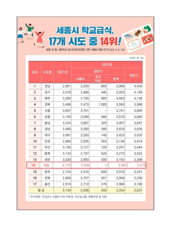 김효숙 의원은 교육청 교육행정국을 대상으로 “지난 추경을 통해 세종교육청 급식 지원금액을 증액한 것인데도 2022학년도 하반기 시도별 급식비를 살펴보면, 17개 시도 중 최하위권에 속하는 14위(3,315원)에 불과하다”며 “전남은 4,426원으로 세종과 1,000원 넘게 차이나며 경기도(4,168원)와 제주도(4,168원)도 4,000원을 넘어섰다”고 지적했다.