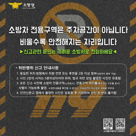 지난 6월 2일부터는 행정안전부에서 운영하는 ‘안전신문고’ 앱을 통해 소방차 전용구역 내 불법 주·정차 차량에 대한 신고가 가능하다.