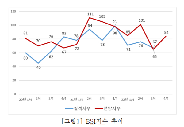 한편, BSI는 기업들의 현장체감경기를 수치화한 것으로 100 이상일 때는 경기가 지난 분기보다 긍정적으로 보는 기업이 많다는 것을 의미하고, 100 미만이면 그 반대를 의미한다.