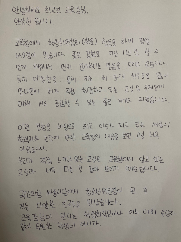 - 중고등학교의 학력 저하 논란과 관련해 최교진 교육감에게 자필편지