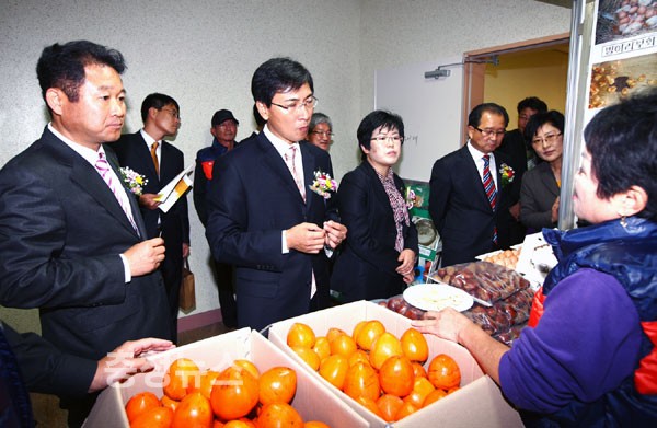 ▲ 안희정 충남지사와 이석화 청양군수가 생산품 전시회에서 고구마를 맛 보고 있다.