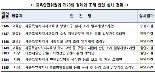 교육안전위원회는 세종시교육청에서 제출한 조례안 4건 중 3건을 원안 가결하고 1건을 수정 가결했으며, 세종시청에서 제출한 조례안 2건과 동의안 1건을 원안 가결했다.
