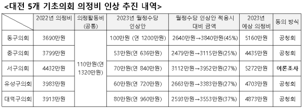 대전 5개구는 구의원 의정비를 책정하기 위한 절차를 밟고 있다. 지방의원들의 의정비는 4년마다 결정되는 월정수당과 법으로 정해진 의정활동비(광역 월 150만원·기초 월 110만원)로 구성된다. 올해 공무원 보수 인상률(1.4%) 이상으로 월정수당을 올리려면 공청회 등 주민 동의가 선행돼야 한다.