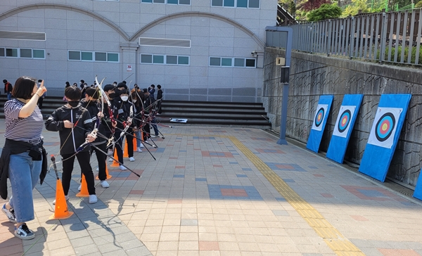 찾아오는 직업체험은 기존에 반응이 좋았던 활동으로 학급마다 학생들이 선호하는 직업을 한 가지 선정해 해당 직업에 대한 간단한 체험을 학교 안에서 할 수 있는 활동이다. 매년 다른 직업을 한 개씩 체험해 진로에 대한 꿈을 키워갈 수 있도록 진행되고 있다. 올해 진로 테마는 지역사회의 교육활동 참여를 이끌어 낼 수 있도록 학부모 교육기부를 제안하여 전교생이 양궁체험에 참여했다. 학생들은 태어나서 처음 만져보는 실제 양궁 활을 전문가의 도움을 받아 쏴보며 TV에서만 보던 양궁을 실제로 해 보는 귀중한 경험을 할 수 있었다.