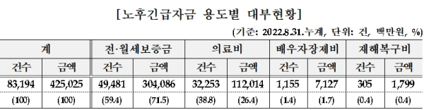 긴급자금 대부 용도는 주택 전·월세보증금, 의료비, 배우자 장제비, 재해복구비가 있으며 이 중 주택 전·월세보증금이 72%로 전체 대부금액 중 가장 많은 비중을 차지하고 있다.