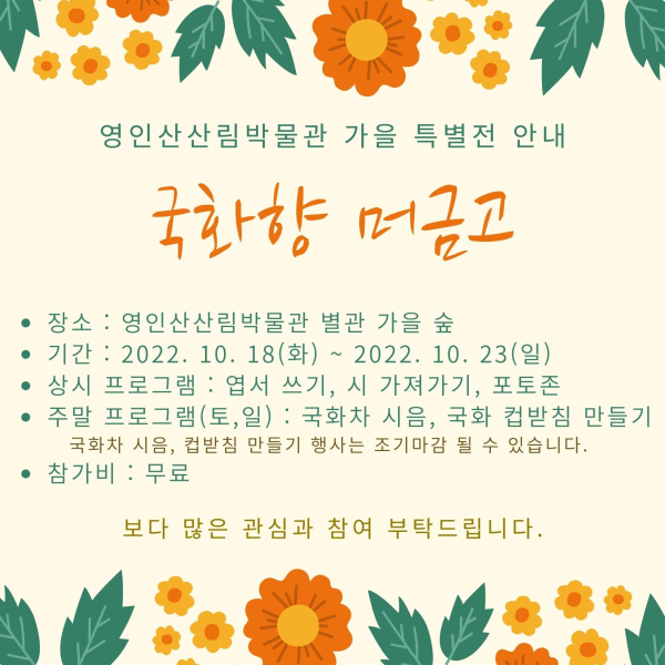 이번 특별전 기간 동안 엽서 쓰기, 시 가져가기, 포토존 등 다양한 체험프로그램이 영인산산림박물관 별관에서 상시 운영되며, 개막일(18일)과 주말(22~23일)에는 국화차 시음, 국화 컵받침 만들기 행사도 펼쳐진다.