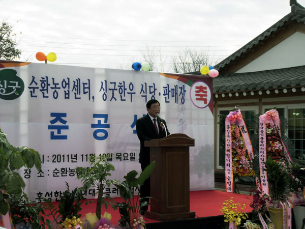 이날 준공식은 홍성한우클러스터사업단의 주관 아래 순환농업센터와 부속시설인 홍성한우 식당, 그리고 특산물 판매장의 준공에 따라 김석환 홍성군수, 김원진 홍성군의회 의장, 농림수산식품부와 충남도 관계자를 비롯한 내외빈과 주민 등 300여명이 참석한 가운데 진행됐다.