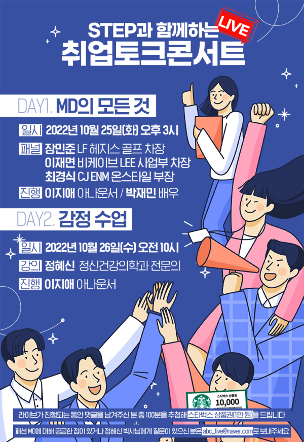 1일 차는 ‘MD의 모든 것’이라는 주제로 새로운 직업에 다가갈 수 있는 구직스킬에 대해 다루며, 2일 차는 ‘감정 수업’을 주제로 취업준비생의 회복과 치유를 도울 수 있는 상담심리 강연이 이어질 예정이다.