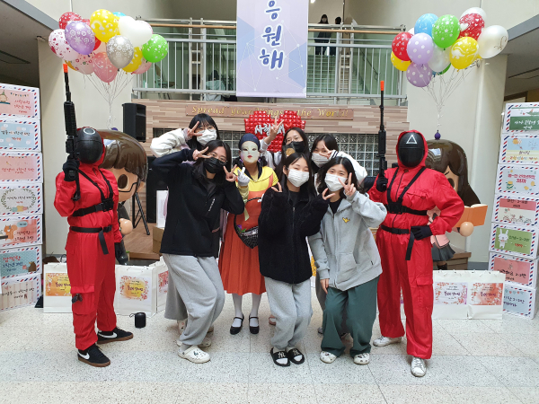 학부모회 임원들은 점심시간에 영화 ‘오징어 게임’의 등장인물 복장을 하고, 다양한 게임에 참여한 학생들에게 수능 대박 기원의 의미로 소정의 선물을 증정했다.