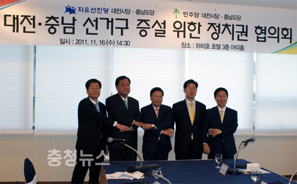 '대전·충남 선거구 증설을 위한 정치권 협의회'가 16일 둔산동 하히호호텔 3층에서 개최된 가운데 대전, 세종시, 천안 선거구 문제를 두고 "투쟁이 필요하다면  총력 투쟁을 지원할 것"이라면서 한 목소리 높여 내년 19대 총선 이슈로 부각 될 것으로 관측된다.