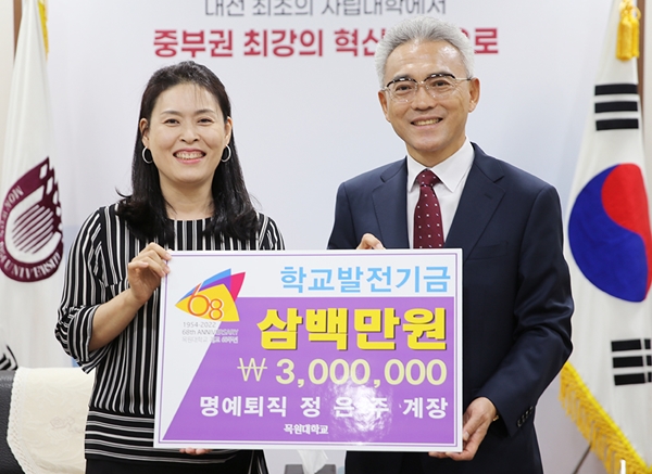 [충청뉴스 이성현 기자] 목원대학교는 지난 8월 명예퇴직한 정은주 전 계장으로부터 학교발전기금 300만원을 전달받았다고 28일 밝혔다.
