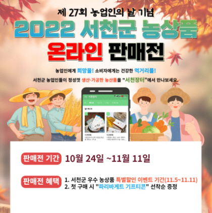 [충청뉴스 서천 = 조홍기 기자] 서천군이 내달 11일까지 온라인 플랫폼인 ‘서천장터’에서 서천군 우수 농상품 온라인 판매전을 개최한다.