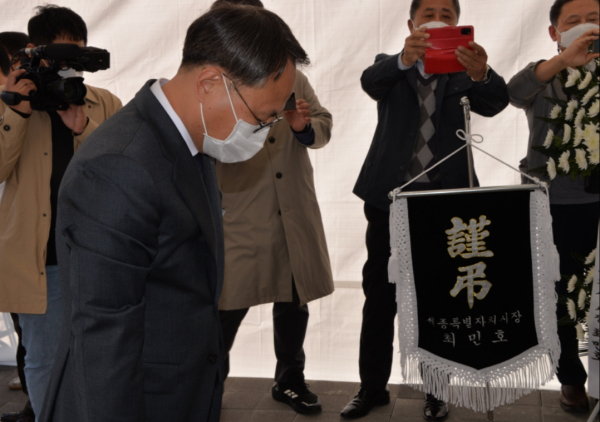 최민호 세종특별자치시장은 고기동 행정부시장, 이준배 경제부시장을 비롯한 국장들과 함께 합동분향소’를 찾아 이태원 사고로 사망한 고인과 유가족에게 애도를 표했다.