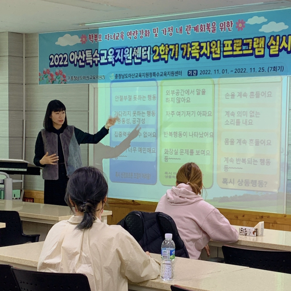 [충청뉴스 박동혁 기자] 충청남도아산교육지원청 특수교육지원센터는 오는 25일까지 특수교육대상 학생 보호자 81명을 대상으로 학부모 소통과 자녀에 대한 이해 증대 및 진로·직업교육 방향 제시 능력을 신장시키기 위해 가족지원 프로그램을 실시한다고 2일 밝혔다.