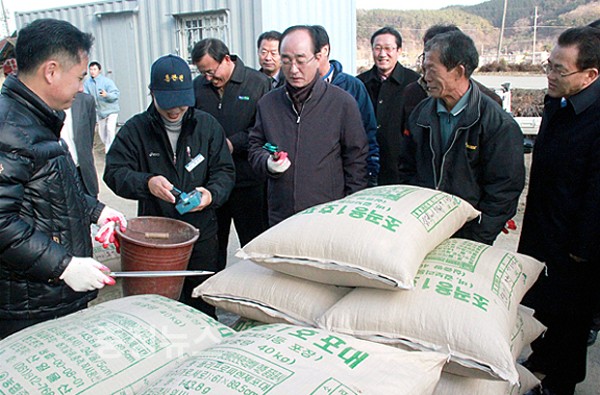 자유선진당 심대평 대표는 24일 연기군 금남면 감성리 벼수매 현장을 방문해 수매현장을 지켜보고 수매농민들의 의견을 청취하고 격려했다.