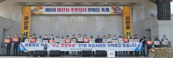 이현상 아산시 주민자치연합회장은 “국립경찰병원이 아산으로 유치될 수 있도록 아산시 모든 주민자치위원이 한마음 한뜻으로 역량을 모을 것”이라며 “이 자리가 즐겁고 뜻깊은 화합의 한마당이 되길 바라고, 아산시 주민자치 발전을 위해 더욱 노력하겠다”고 말했다.