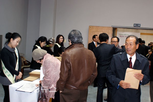 ▲ 문학·예술 등 다양한 분야의 방문객들이 권득용 회장의 시집을 사고 있다.