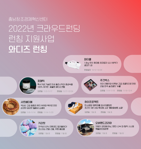 이번 펀딩은 지원기업 7개사(충남창업마루나비 입주기업 5개사, 충남도내 창업기업 2개사)의 제품 ∆파티클의 무선 방역기 ∆포메틱의 바디스크럽 ∆주크박스의 술초콜릿 ∆샤르베티에의 킬바사 소세지 ∆오버랜드코리아의 자동차 어닝용 브라켓 ∆하이프로젝트의 에이퍼센트 소파 ∆키리릿의 배쓰밤이 런칭된다.