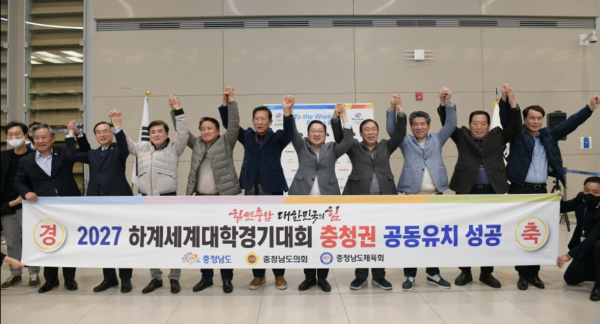 충청권 4개 시도지사, 의회의장, 체육회장 등으로 구성된 충청권 공동대표단이 ‘2027 하계세계대학경기대회 충청권 유치’라는 큰 성과를 안고 14일 인천공항으로 귀국했다.
