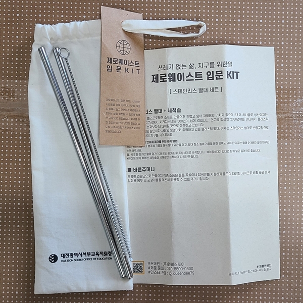 제로웨이스트 입문 키트는 도톰한 면원단 주머니에 스테인리스 빨대와 세척솔을 구성한 것으로 해양 동물과 사람의 생명을 위협하는 플라스틱 빨대의 사용을 줄이고 반영구적으로 사용 가능한 소재의 빨대를 사용함으로써 쓰레기 없는 삶을 실천하며 생명을 지키는 일에도 동참할 수 있다.