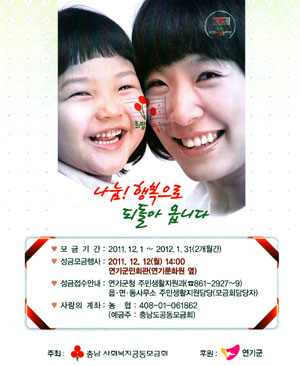 연기군(군수 유한식)은 내달 1일부터 2012년 1월 31일까지 62일간에 걸쳐 ‘희망2012 나눔캠페인’ 성금모금 운동을 펼친다.