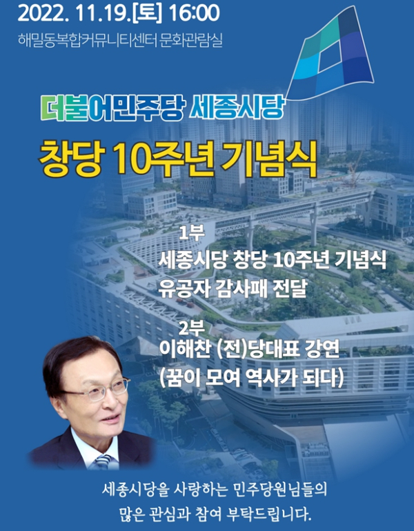 [충청뉴스 최형순 기자] 더불어민주당 세종시당(위원장 홍성국)은 19일 오후 4시 해밀동복컴 문화관람실에서 창당 10주년 기념식 개최와 이태원 참사 국정조사특검추진 국민서명운동본부 발대식에 이어 이해찬 前대표 강연회를 개최한다.