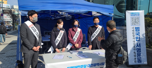 지난 15일 대전역 서광장에서 '이태원참사 국정조사·특검 추진 대전 범국민 서명운동본부 출범식'을 가진 대전시당은 천막당사 이외도 각 지역위원회별로 국정조사와 특검을 요구하는 범국민 서명 운동을 전개하고 있다.
