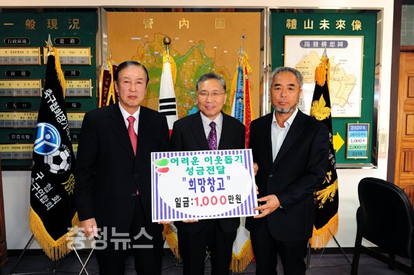 예산군(군수 최승우)지역 자원봉사자들로 이뤄진 재활용품 나눔가게인 희망창고(대표 김진형)에서 지난 1일 예산군청을 방문해 ‘희망2012 나눔캠페인 이웃돕기 성금모금’에 1000만원을 기탁했다.