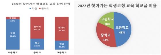 「찾아가는 학생 코칭 교육」에는 초등학교 6학년 27개 학급과 2개 동아리, 중학교 7개 학급과 14개 동아리, 고등학교 3개 학급과 8개 동아리(총 61교, 학생 1,171명)가 참여하였다. 초등학교는 학급 단위, 중·고등학교는 동아리 단위로 주로 참여하여 학교급이 올라갈수록 동아리 단위 참여율이 높았음을 알 수 있었다. 참여 동아리는 또래 상담 동아리, 진로동아리, 학습코칭 동아리 등 다양하였다.