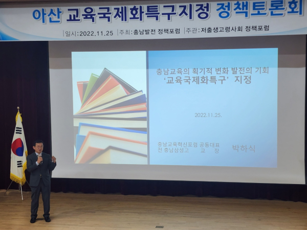 이날 토론회에서는 이명수 국회의원, 김영석 전 해양수산부 장관을 비롯한 지역 시민들이 참여한 가운데 저출생 고령사회 대책 시민포럼 장진환 대표가 좌장을 맡고, 박하식 전 교장이 ‘충남교육의 획기적 변화 발전의 기회 교육국제화특구 지정‘을 주제로 발제에 나섰다.