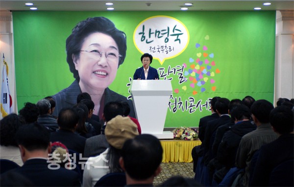 한명숙 前 국무총리가 8일 대전 오페라웨딩홀에서 ‘무죄판결 환영 및 정치콘서트’를 갖고 총선 승리와 정권교체를 통한 검찰 개혁의 당위성을 주장했다.