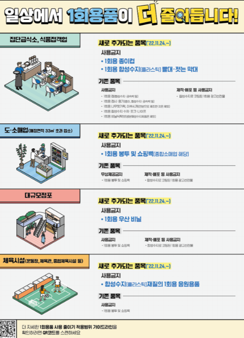 식당과 카페 등 식품접객업소와 집단급식소의 매장 내에서 1회용 종이컵, 플라스틱 빨대·젓는 막대 사용도 전면 금지된다. 다만, 집단급식소나 식품접객업소는 매장 외의 장소에서 소비할 경우 1회용품을 무상제공할 수 있다.