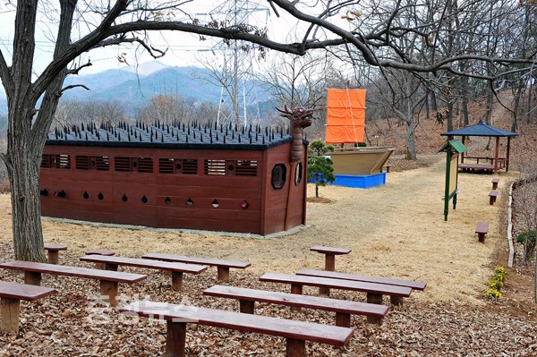 중구가 지역공동체 일자리사업으로 조성한 우리민속 체험장에는 거북선을 비롯해 나룻배, 원두막, 장승, 물레방아, 디딜방아, 장승, 솟대, 지게 등 20여 종 500개의 민속품이 설치돼 있다.