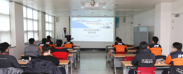 교육은 ▲응급의료 전용헬기 운영개요 및 현장출동 ▲항공기 이송환자 관리 및 환자감시와 제세동 ▲기도관리와 산소치료 ▲전문기도관리와 사례 리뷰 등에 대해 전문의료진이 강사로 나서 심도 있게 이뤄졌다.