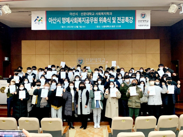 특강 후 명예 사회복지공무원 위촉장 전달식이 진행됐다. 이번 위촉을 통해 선문대 사회복지학과 학생들은 ‘청년 지역복지 활동가’로 활동하며 도움이 필요한 어려운 이웃을 상시 발굴해 읍면동 행정복지센터에 연계하는 역할을 하게 된다.