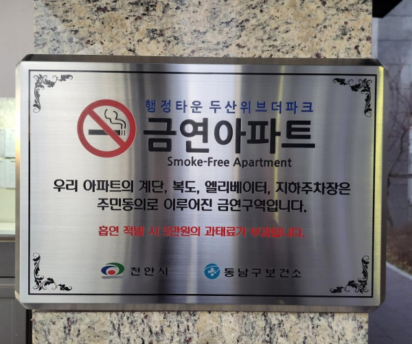 동남구보건소에 따르면 금연아파트는 국민건강증진법 제9조 제5항에 따라 공동주택 세대주 절반 이상 동의 시 공용공간인 복도, 계단, 엘리베이터, 지하주차장 전부 또는 일부를 금연구역으로 지정하는 제도다.