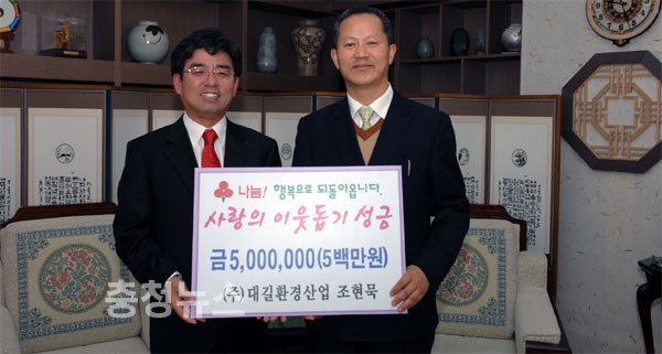 시 이인면 만수리에 있는 (주)대길환경산업(대표 조현묵)은 15일 공주시청을 방문, 이준원 공주시장에게 이웃돕기 성금 500만원을 기탁했다.